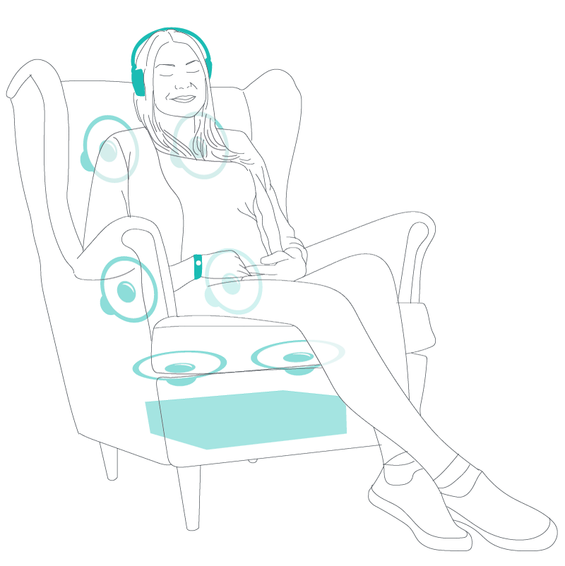 בלב הכורסה משולב מנגנון ייחודי ובלתי נראה לעין, המפעיל את הגוף בעזרת טיפול בויברציות אקוסטיות (Acoustic Vibration Therapy) ו-טיפול באמצעות צלילים (Sound Therapy) – שיטות שהוכחו כיעילות במחקרים קליניים בתחום הוויסות העצבי והאיזון הנפשי.